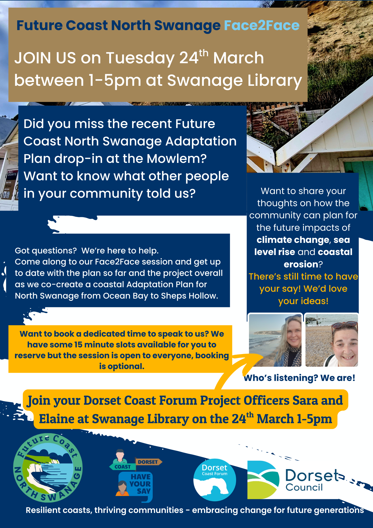 Sara Parker and Elaine Snow Project Officers for Dorset Coast Forum will be holding a Face2Face session at Swanage Library on Tuesday 24th March between 1-5pm to share the thoughts and opinions from the Swanage community who attended our recent Adaptation Plan workshop and drop-in at the Mowlem.