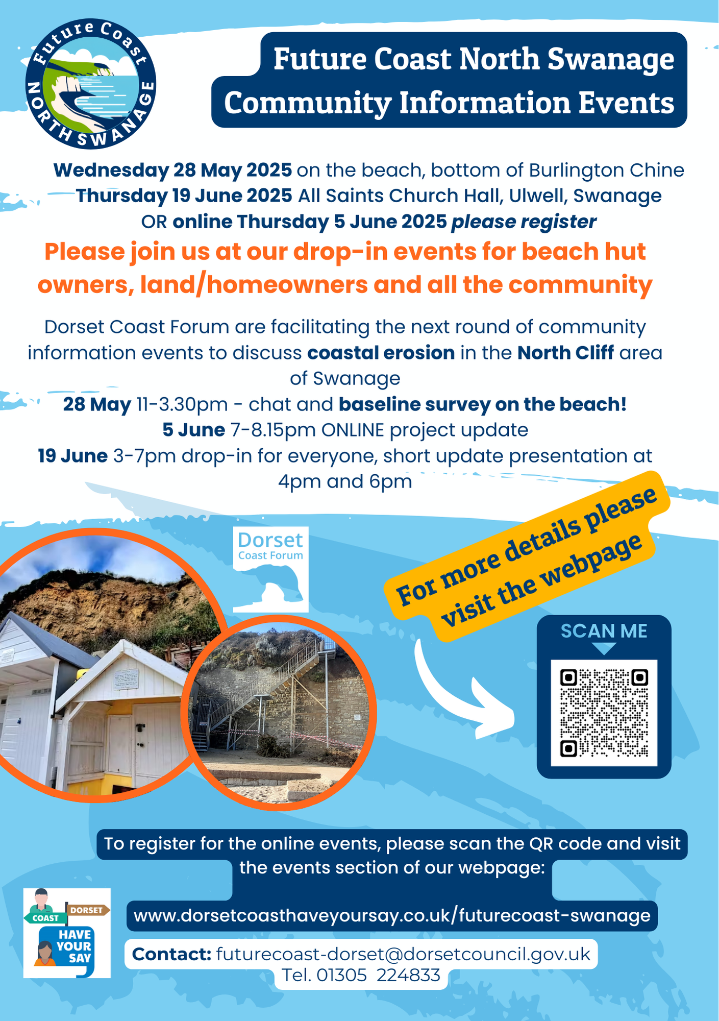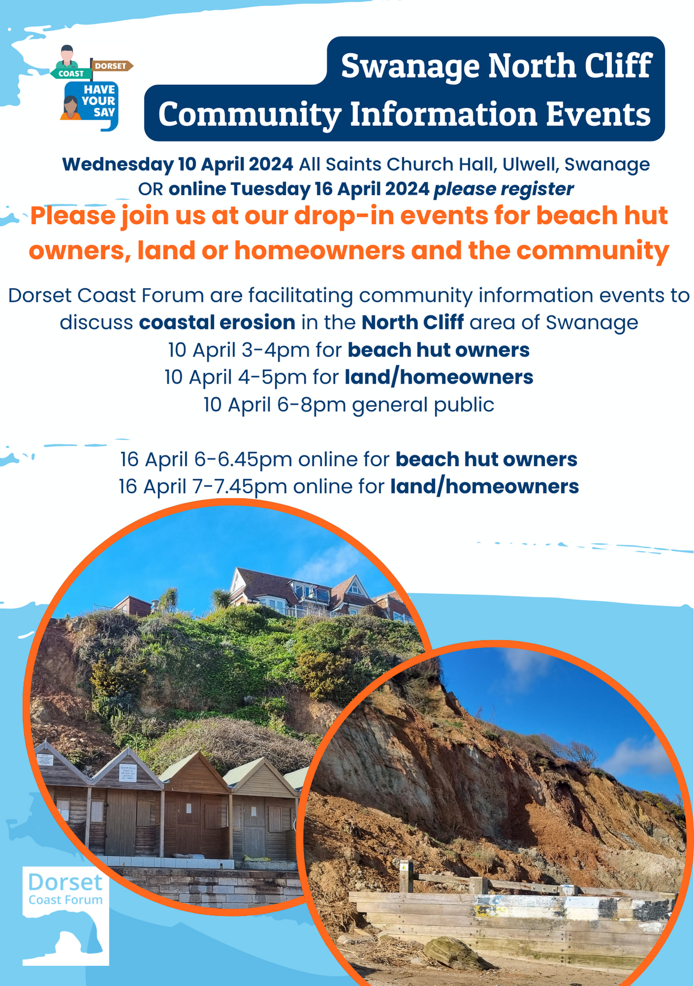 Swanage North Cliff online engagement event 16 April 2024 18:00-18:45 for beach hut owners. You can register using this link Swanage North Cliff online engagement event - beach hut owners