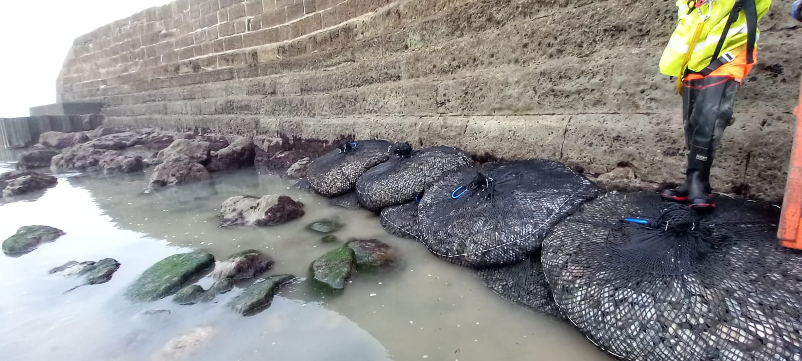 In the meantime, 11 temporary one-tonne rock bags were placed around the void to create a protective barrier. The bags have been lashed together and will absorb wave energy, thus mitigating the impact of any winter storms.