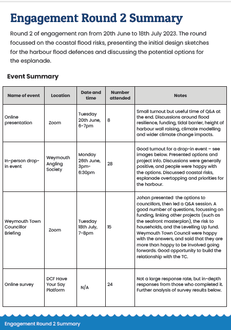 Two pop-up events were also held during the consultation period at external Dorset Coast Forum events. This was to solely raise awareness of the scheme and allow passers-by to pick up calling cards or scan QR codes which directed them to the Weymouth FCRM webpage and survey. The events were: